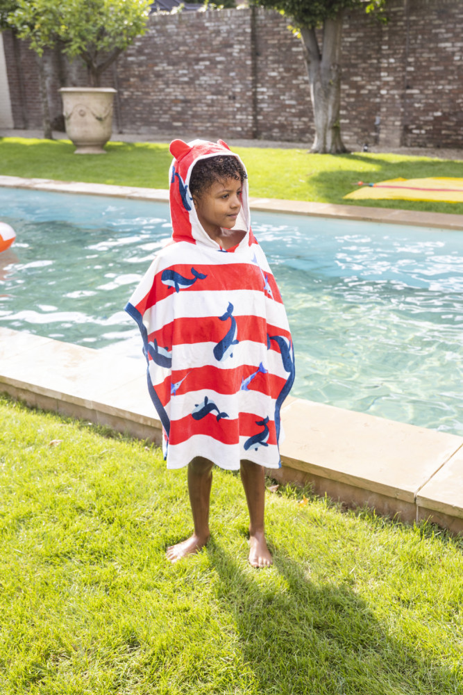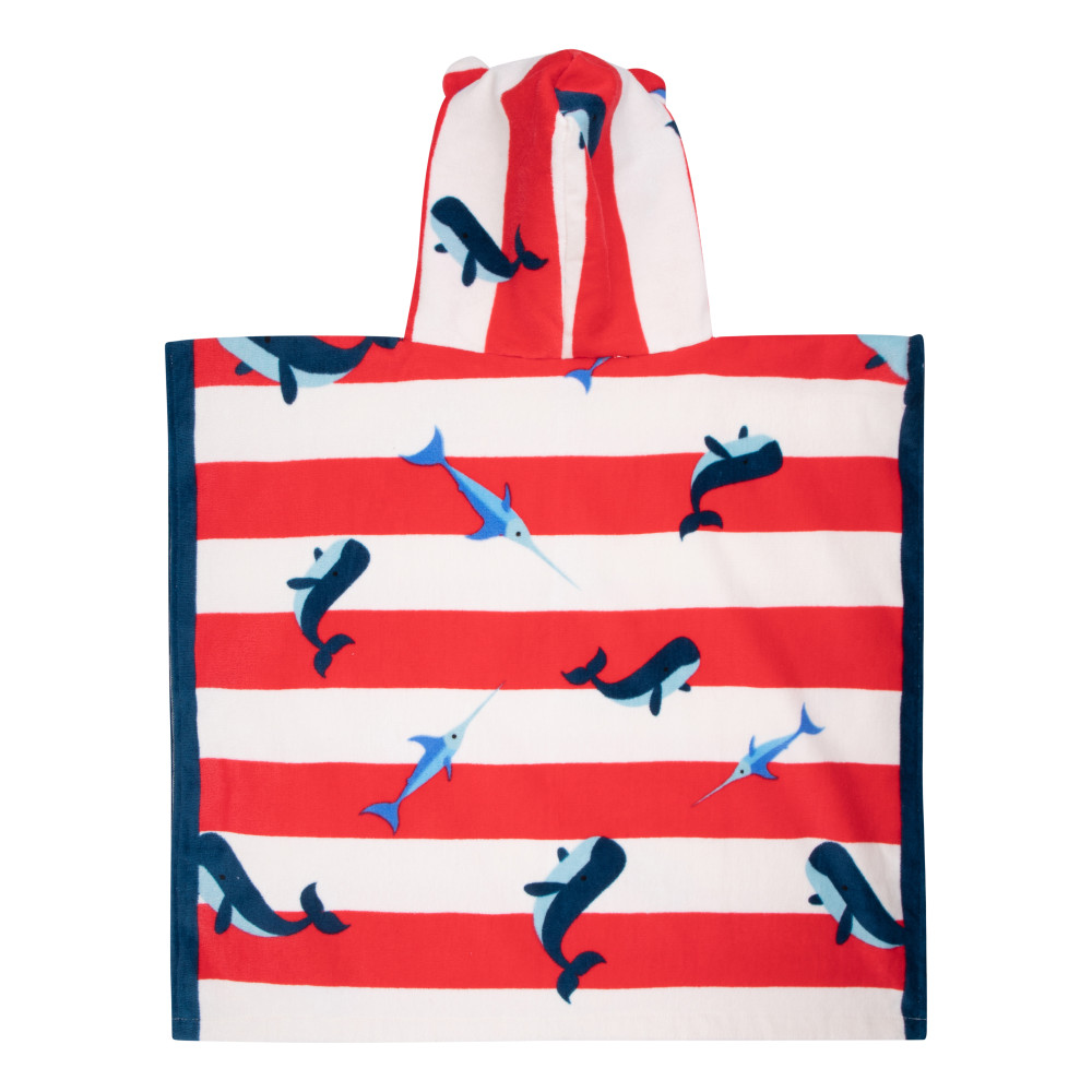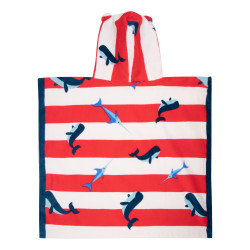 Praktické detské plážové pončo s kapucňou od Swim Essentials s nadčasovými bielo červenými prúžkami a s veľrybami si deti určite zamilujú! Rady sa do neho oblečú hneď, ako vylezú z vody. Rýchlo im vysuší pokožku a príjemne ich zahreje. Môžu sa v ňom hrať alebo behať okolo vody bez toho, aby im bola zima. Oceníte premyslený strih aj kvalitné spracovanie