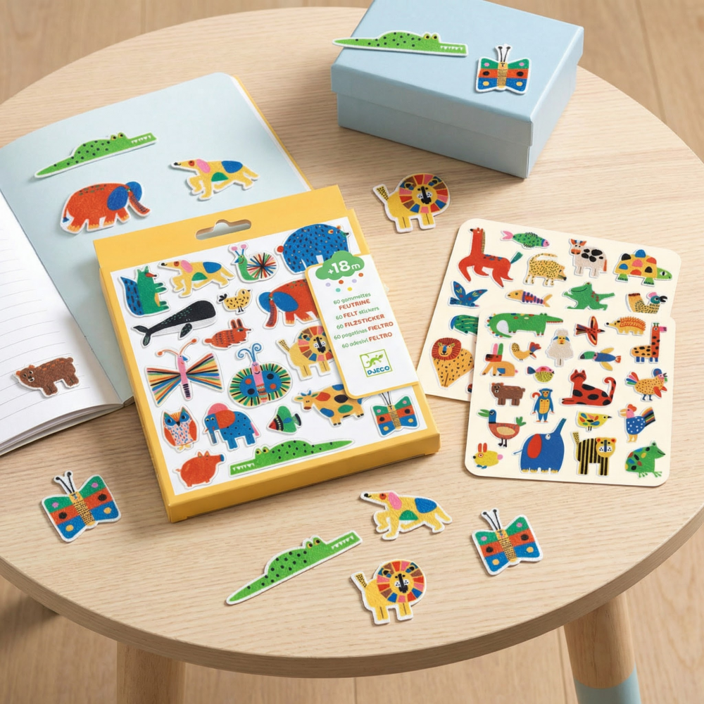 Plstené samolepky Zvieratká sú jednoduchá tvorivá aktivita pre najmenších, ktorá ich bezpečne a hravo zoznámi s lepením.Samolepky sú z mäkkej plsti a majú vystúpené/obrysové tvary, takže sa dobre držia v malých ručičkách a ľahko sa odlepujú z podkladu.Dieťa ich môže lepiť na papier, zošit alebo výkresy a vytvárať vlastné obrázky plné zvieratiek – bez neporiadku a bez lepidla.Obsah balenia 60× plstená samolepka so zvieratkamiRýchly prehľad odporúčaný vek: od 18 mesiacov formát balenia: približne 20 × 20 cm materiál: mäkká plsť (ľahko uchopiteľné tvary) rozvíja: jemnú motoriku, koordináciu oko–ruka, kreativitu udržateľnosť: kartónový obal s FSC certifikáciou