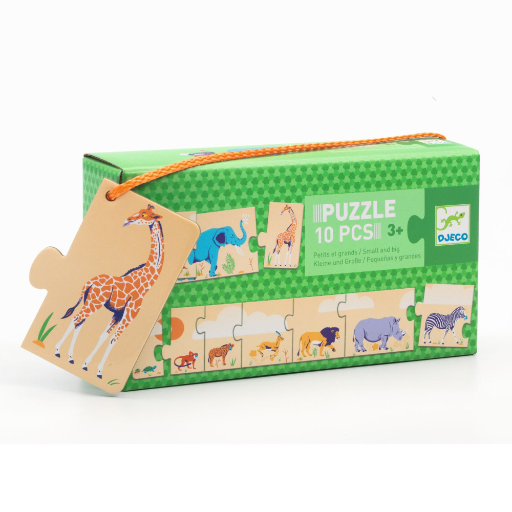 Postupové puzzle – Africké zvieratá (malý, väčší, najväčší)Skladanie podľa veľkosti pre najmenšíchPostupové puzzle malý – väčší – najväčší s motívom afrických zvierat sú ideálne prvé puzzle pre malé deti. Dieťa skladá zvieratká od najmenšieho po najväčšie, čím sa prirodzene učí porovnávať veľkosti a vnímať postupnosť. Puzzle pozostávajú z 10 pevných dielikov, ktoré sú prispôsobené malým detským rukám. Jednoduchý princíp skladania podporuje samostatnú hru a prináša deťom radosť z úspechu.Čo si dieťa pri hre precvičírozlišovanie veľkostí (malý – väčší – najväčší)logické myslenie a poradiejemnú motorikukoordináciu ruka–okosústredeniePrečo si vybrať puzzle od Djecoideálne ako prvé postupové puzzlekrásny motív afrických zvieratpevné dieliky vhodné pre malé rukyjednoduché a zrozumiteľné skladanievhodné pre deti od 3 rokov