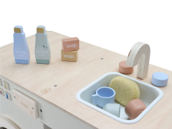 Štýlový drevený set práčky a drezu Little Dutch poteší každé dieťa, ktoré sa rado stará o svoje bábiky či plyšáky. V práčke im vyperie ich oblečenie, v dreze umyje riad, na ktorom servírovalo bábikám desiatu. Vďaka otočným gombíkom, tlačidlám aj vysúvacej priehradke na prací prostriedok pôsobí práčka aj drez realisticky a podnecujú deti k napodobňovaniu domácich prác. Súčasťou balenia je bohaté príslušenstvo: štyri šálky, štyri podšálky, špongia, prací prostriedok, mydlové kocky a látková utierka.