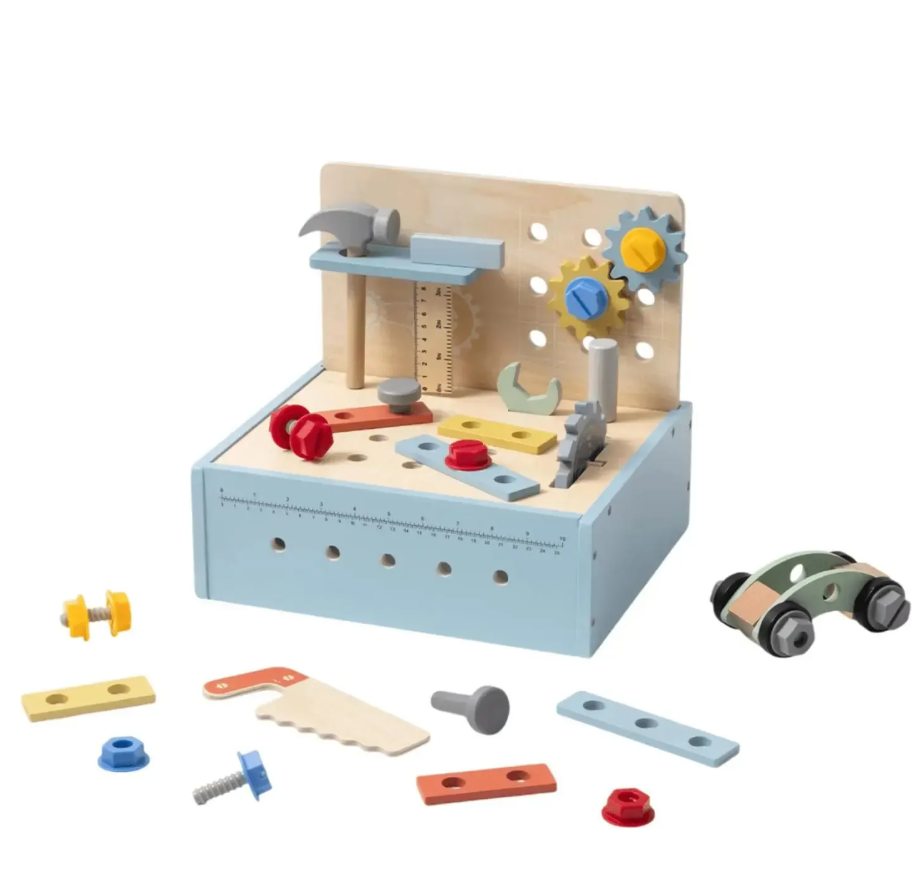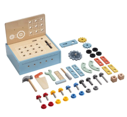 Pripraviť sa, pozor, opravujeme! Tento prenosný drevený pult s náradím je ideálna hračka pre malých majstrov, ktorí radi objavujú, skrutkujú, montujú a opravujú. Deti môžu použiť kladivko, pílu, kľúče či skrutkovač a vytvárať rôzne konštrukcie pomocou skrutiek, matíc a drevených dielikov.