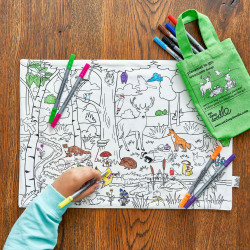 Prestieranie na vyfarbenie Woodland je ideálnym spôsobom, ako deti zabaviť a vzdelávať o prírode. Toto 100% bavlnené prestieranie obsahuje nádherné lesné zvieratá, hmyz a kvety, ktoré deti môžu vyfarbiť pomocou 10 umývateľných fixiek. Na prestieraní nájdu priestor na písanie svojich vlastných poznámok o prírode a kreslenie zvierat. Po praní je prestieranie pripravené na ďalšie farbenie, čo umožňuje deťom nekonečné objavovanie lesného sveta. Tento ekologický a opakovane použiteľný darček je skvelý pre deti, ktoré milujú prírodu, zvieratá a tvorivé aktivity. Perfektný darček na narodeniny, Vianoce alebo ako vzdelávací darček!
