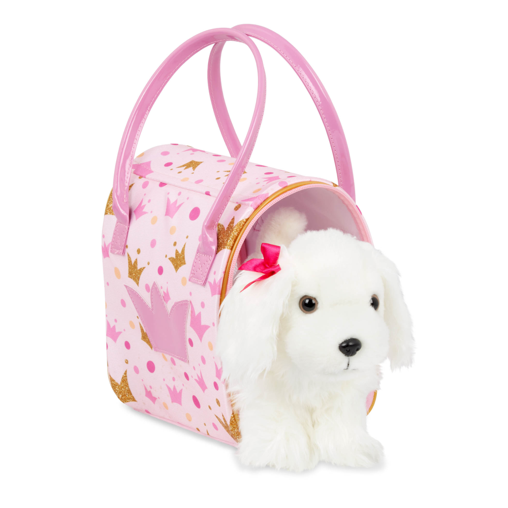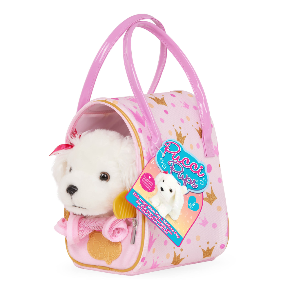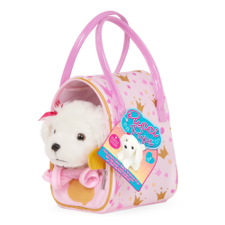 Rozkošné plyšové šteňa v taške s krásnou potlačou je vždy pripravené na maznanie aj na prechádzku. Miluje vyčesávanie svojej hebkej srsti hrebienkom a vďaka taške si ho vaše dieťa môže vziať kamkoľvek. Taška má priehľadnú prednú stenu zo sieťoviny s otváraním na zips, aby šteniatko pri prenášaní videlo na svet.