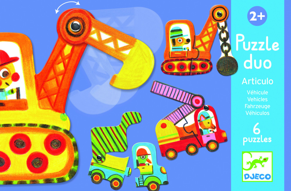 Puzzle duo Vozidlá Veselé auto, nakladač, žeriav, bager a iné.. Každý dopravný prostriedok sa skladá z 2 častí puzzle. Pre deti od 2 rokov. Balenie obsahuje 6 x 2 kusy puzzle.Materiál: pevný, vytvrdený kartónRozmer balenia: 18 x 12 x 6 cm