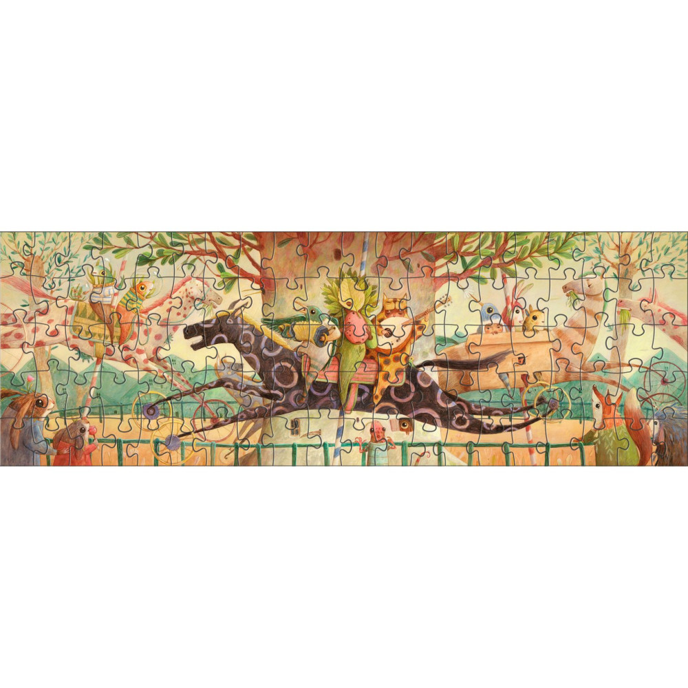 Puzzle Nádherná jazda – galéria prináša deťom skladanie podlhovastého obrázka plného pohybu, farieb a detailov. Galériový formát pôsobí ako umelecký obraz a po zložení sa stáva krásnou dekoráciou detskej izby. Skladanie 100 dielikov ponúka ideálnu rovnováhu medzi zábavou a výzvou a podporuje pokojné, sústredené hranie.Prečo si vybrať toto puzzle od Djeco- vhodné pre deti od 5 rokov, 100 dielikov ideálnych pre predškolákov a mladšie školské deti, galériový formát s umeleckou ilustráciou, dynamický motív plný detailov a pohybu, podporuje pokojné a sústredené hranie, kvalitné spracovanie dielikov a pevná krabica. Obsah balenia- 100 puzzle dielikov, ilustrovaná predloha hotového obrázka, pevná krabica vhodná na skladovanie