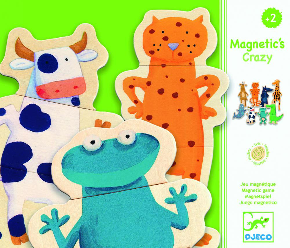 Puzzle magnetky Trojdielne magnetické puzzle. Sada obsahuje 8 drevených magnetických zvieratiek rozdelených na tri kusy: hlava, trup, nohy. Deti si pri skladaní užijú veľa zábavy nakoľko zostavovať môžu zvieratká z rôznych dielikov podľa vlastnej predstavivosti a zostaviť tak nového tvora. Vytvárajte vlastné bláznivé kombinácie. Set obsahuje celkom 24 drevených puzzle dielikov. Nájdete tu kravu, mroža, žabu, leoparda, vlka, žirafu, krokodíla a jeleňa. Zvieratká je možné umiestniť napr. na chladničku. Magnetky rozvíjajú predstavivosť, jemnú motoriku a koordináciu oko – ruka. Materiál: drevo