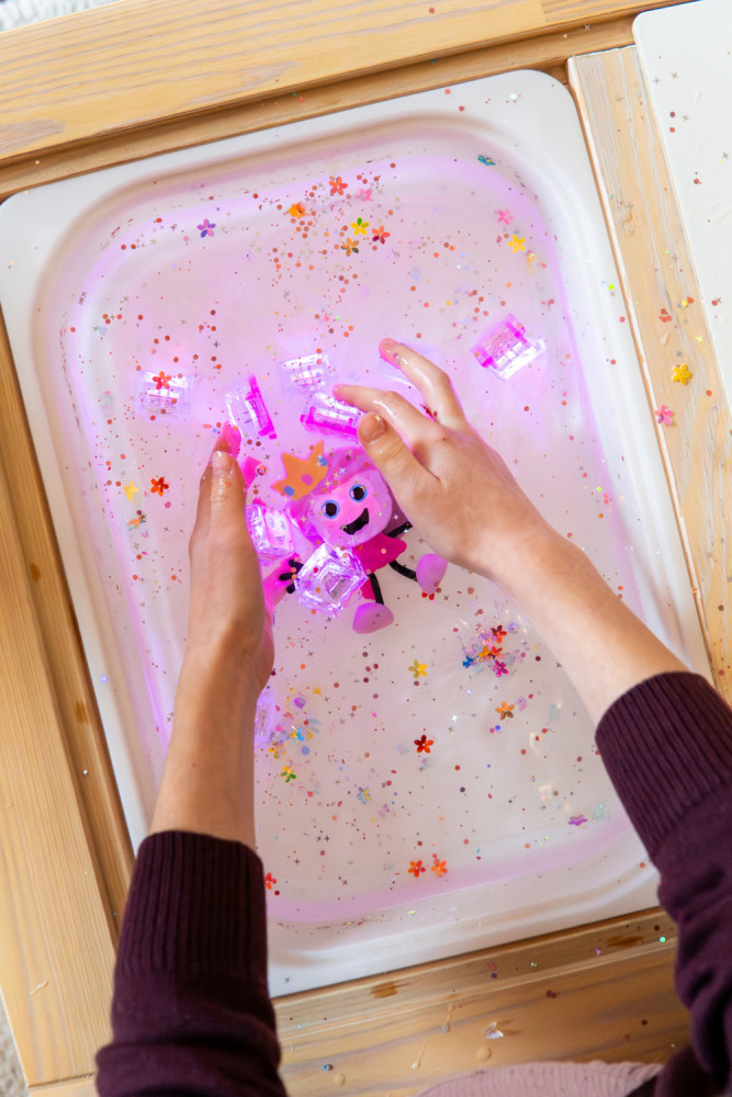 Sada Figúrka Princess Ida a 2 senzorické svietiace kocky do vody od značky Glo Pals prináša do kúpeľa svetlo, farby a hravý interaktívny zážitok. Stačí vložiť svietiacu kocku do figúrky a po kontakte s vodou sa hračka rozsvieti. Kúpanie sa tak mení na veselú hru, ktorá deti zaujme a zároveň podporuje ich zmyslové vnímanie, zvedavosť aj prirodzené objavovanie.