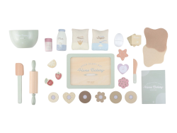 Sada obsahuje všetko potrebné na pečenie: kartičku s receptom, drevené suroviny ako vajcia, maslo, múku, cukor, mlieko, farebné posypky ak tomu misu na miešanie, valček, tácku a doplnky na zdobenie. Nechýbajú ani hotové kúsky cukroviniek a plát cesta z plsti, ktorý si môžu deti rozváľať a nazdobiť podľa vlastnej fantázie.