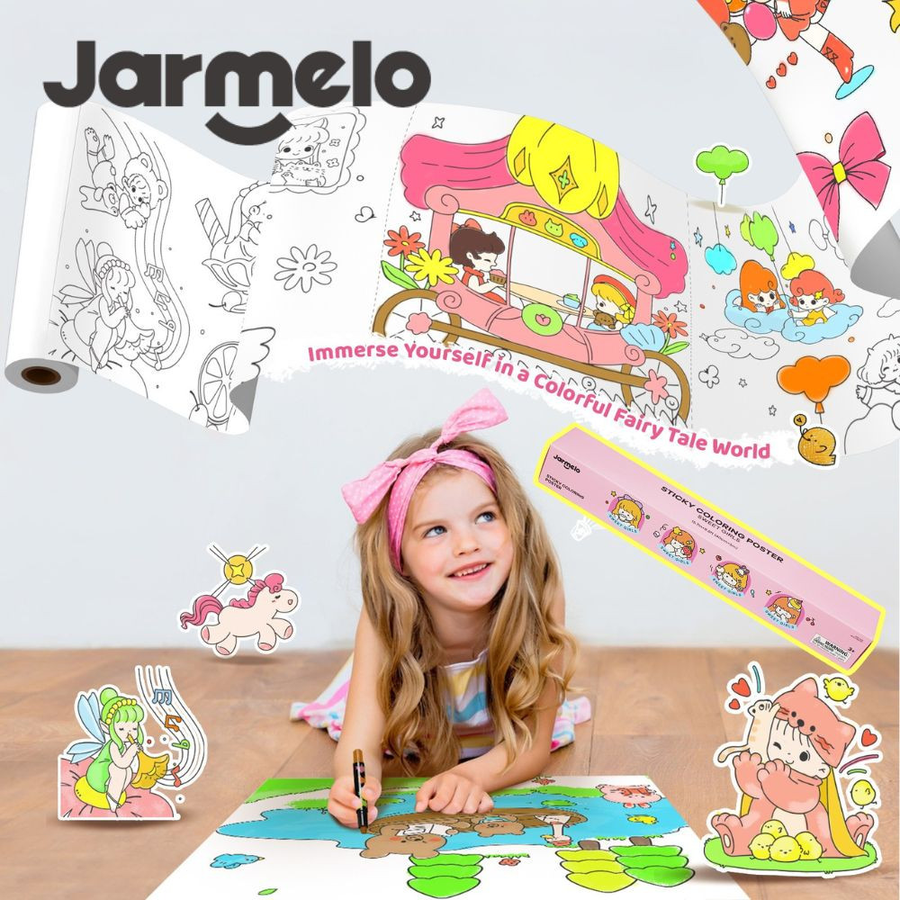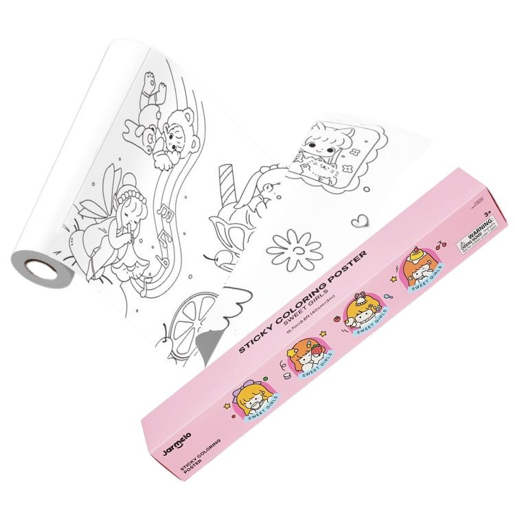 Samolepiaca omaľovánka v rolke Sweet girls od Jarmelo je 3 metre dlhá papierová rolka s motívmi dievčat, ktorú si dieťa prilepí kam chce — na stenu, na podlahu alebo na stôl — a rovno začne vyfarbovať. Lepivý podklad drží spoľahlivo, no pri stiahnutí nezanecháva na povrchu žiadne stopy. Rolka má perforované odtrhávacie linky, takže sa dá použiť ako jeden veľký obraz alebo postupne po menších scénach. Vyfarbené obrázky je možné vystrihnúť a používať ako vlastnoručne vyrobené samolepky.