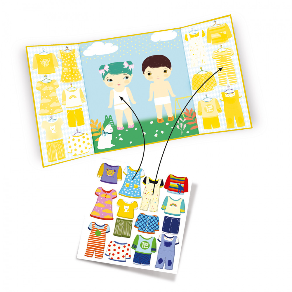 Znovuodlepiteľné samolepky a podložka s obrázkom obliekajúcich sa detí. Bábiky čakajú, aké oblečenie im vyberieš. Hraj sa s obrázkami, stále znovu! Na podložku- deti nalepujú oblečenie a obliekajú ich! Podložka má na bokoch zatvárateľné strany, kde je miesto na odloženie samolepiek. Samolepky sú znovuodlepiteľné a môžeš ich pohodlne prelepovať. Zatvárateľná podložka je veľmi praktický formát na hranie a zároveň uschovanie samolepiek. Malý kreatívny darček pre drobcov. Obsah: podložka na lepenie, hárok vinylových samolepiek. Odporúčaný vek: 18+ mesiacov. Rozmery: 43 x 23 cm.
