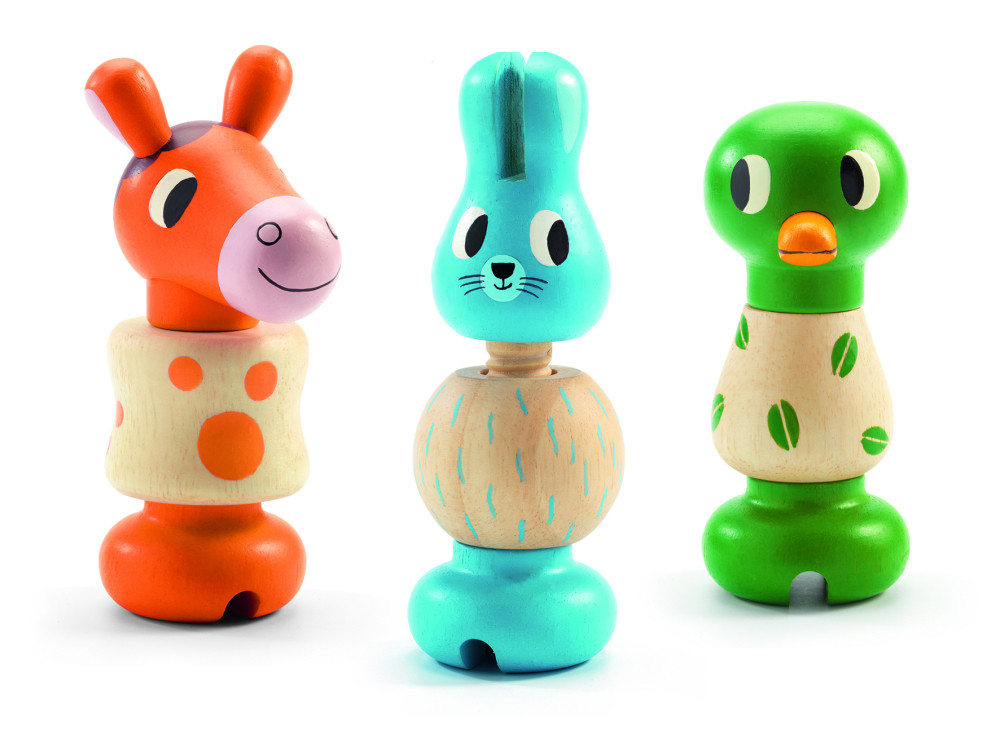 Skrutkovacie zvieratká Každá figúrka je trojdielna, tvorí ju hlavička, trup a stojan. Drevená skrutkovacia hračka Rondanimo pozostáva z troch figúrok: koníka, zajačika a kačky. Hlavička zvieratka je aj hlavou skrutky, na ktorú sa zakrúcajú ostatné dva diely. Pri zostavovaní figúrky dieťa používa obe ruky, cvičí si motoriku, koordináciu a spoluprácu rúk. Každá hlavička a trup majú iný tvar, čomu dieťa prispôsobuje úchop. Zhodnosť dielikov dieťa určí podľa ich farby, ale má aj možnosť ich rôzne kombinovať. V neposlednom rade si všimnite veľké oči zvieratiek: každé zvieratko pozerá inam, čo využijete pri cvičení pravo-ľavej orientácie alebo jednoducho pri pomenúvaní vecí, na ktoré sa zvieratká pozerajú.Odporúčaný vek: 18m+Počet dielov: 9Výška figúrky: 10,6 cmRozmery balenia: 16,5 x 12,5 x 6,5 cm