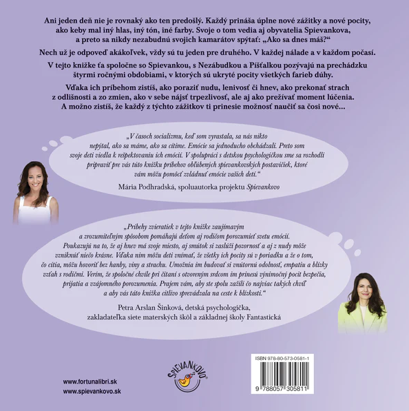Spievankovo My sa mámeDetská kniha plná príbehov zo Spievankova, ktoré učia deti o emóciách a ročných obdobiach.Ani jeden deň nie je rovnaký ako ten predošlý. Každý prináša úplne nové zážitky a nové pocity, ako keby mal iný hlas, iný tón, iné farby. Svoje o tom vedia aj obyvatelia Spievankova, a preto sa nikdy nezabudnú svojich kamarátov spýtať: „Ako sa dnes máš?“ Nech už je odpoveď akákoľvek, vždy sú tu jeden pre druhého. Ideálne pre rozvoj emočnej inteligencie a empatie.V každej nálade a v každom počasí. V tejto knižke ťa spoločne so Spievankou, s Nezábudkou a Píšťalkou pozývajú na prechádzku štyrmi ročnými obdobiami, v ktorých sú ukryté pocity všetkých farieb dúhy. Vďaka ich príbehom zistíš, ako poraziť nudu, lenivosť či hnev, ako prekonať strach z odlišnosti a zo zmien, ako v sebe nájsť trpezlivosť, ale aj ako prežívať moment lúčenia. A možno zistíš, že každý z týchto zážitkov ti prinesie možnosť naučiť sa čosi nové.
