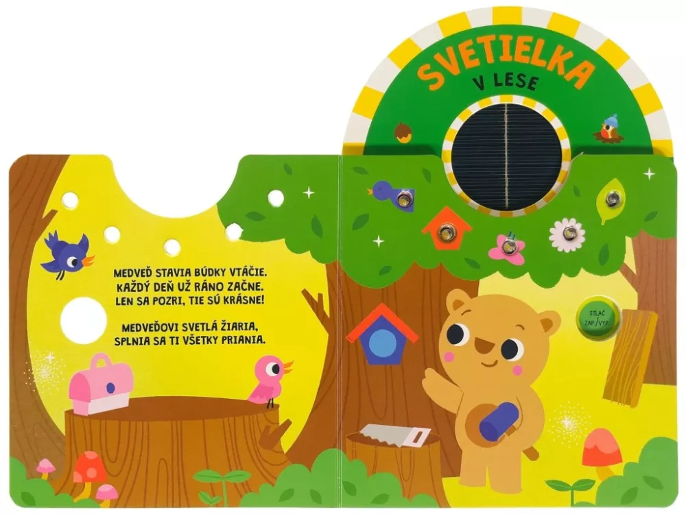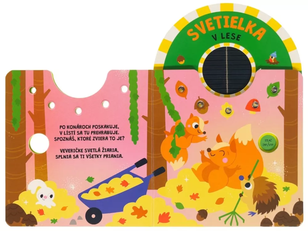 Svetielka v lese – Leporelo so svetielkami na solárnu energiu prináša kúzelnú atmosféru do večerného čítania. Jemne blikajúce LED žiarovky ozdobia les svietiacimi reťazami a girlandami, ktoré navodzujú pokoj a radosť. Medvedík, veverička, jazvec a králik sa hrajú v lese plnom radosti, zatiaľ čo veršované texty a milé ilustrácie podporujú predstavivosť a zmyslové vnímanie detí. Teplé svetlo LED žiaroviek je jemné a neoslňuje oči, čo robí knihu ideálnou pre večerné čítanie pred spaním. Solárne napájanie umožňuje nabiť svetielka počas dňa na slnku bez potreby batérií – stačí večer stlačiť tlačidlo a svetielka jemne blikajú. Leporelo tak spája interaktívne čítanie, ekológiu a relaxačný zážitok pre deti aj rodičov.