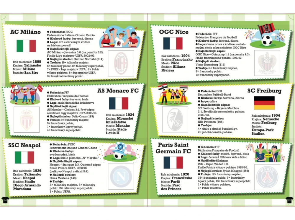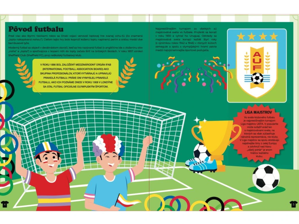 Svetové futbalové kluby so samolepkamiV tejto knižke sa zoznámite s 80 futbalovými klubmi z celého sveta - od najstarších až po tie, ktoré vznikli v 21. storočí.Zaujímavosti o futbalových kluboch z celého sveta v knihe aktivit s veľkým množstvom samolepiek s logami futbalových klubov.Pri každom klube nájdete nielen základné geografické informácie, ale aj zaujímavosti o klubových farbách či logách. Štatistické údaje týkajúce sa mužských tímov zahŕňajú nielen najlepších strelcov a počty strelených gólov, ale i trofeje, ktoré sa klubu v priebehu histórie podarilo získať. Zoznámite sa aj so základnými pravidlami futbalu a s pôvodom tohto športu. V neposlednom rade objavíte a dolepíte SAMOLEPKY obsahujúce logá jednotlivých klubov, ktoré informácie v knihe výborne dopĺňajú.