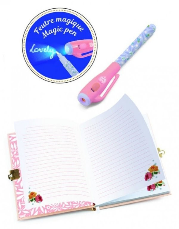 88 -stranový linajkový zápisník s plnofarebnou pevnou obálkou so zlatým metalickým leskom a visacím zámkom s dvoma kľúčikmi. Vyrobený z FSC papiera. Súčasťou je pero s neviditeľným atramentom a zdrojom UV svetla vo vrchnáku. Balený v priehľadnom obale. Každú stranu dopĺňa malá ilustrácia. Skvelé aj na písanie tajných správ. Na písanie tajných zápiskov je určené pero s neviditeľným atramentom. Zápisky sa ukážu až pod UV svetlom. Zdroj UV svetla, tlačidlo na zapnutie/vypnutie svetla a 3 batérie typu LR44 sú priamo vo vrchnáku pera. Batérie sú súčasťou balenia. Vrchnák má praktický klips na pripnutie pera. Pero má fixkový hrot. Zápisník je vyrobený z kvalitného papiera s gramážou 120 gsm (t. j. vyššou než štandardný kancelársky papier) a s ekologickým certifikátom FSC. Rozmery zápisníka: 15,5 x 20 x 1,2 cm. Rozmery pera: 0,5 x 13 cm.