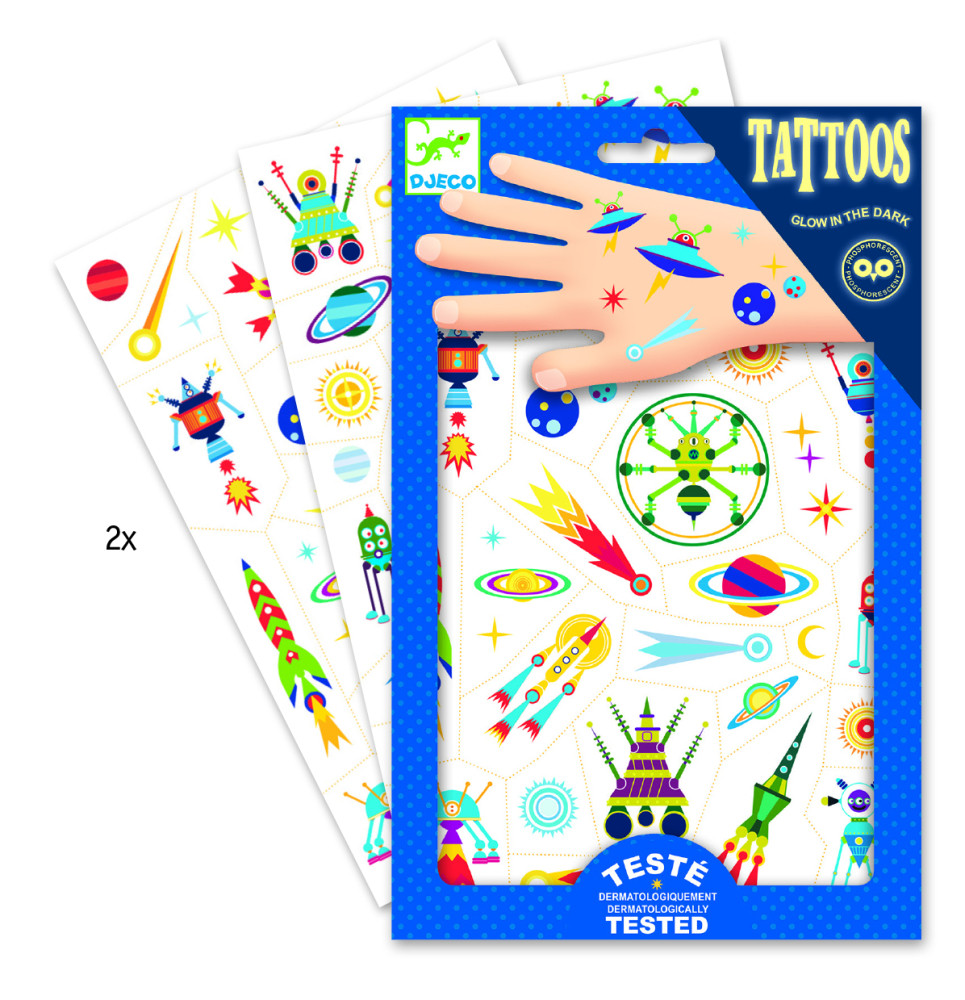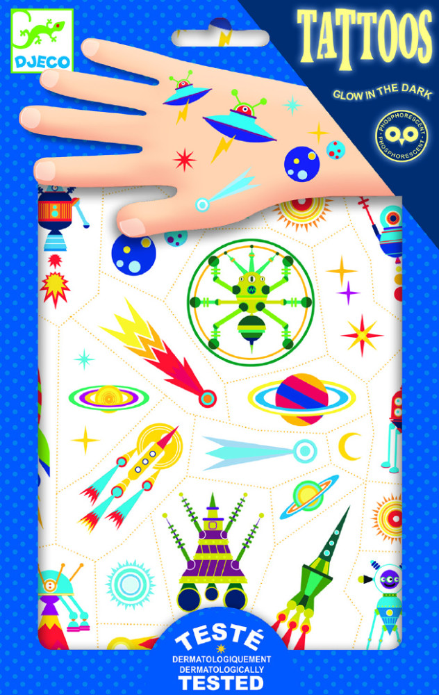 Tetovačky svietiace Vesmír Vesmírne hviezde tetovačky 2 hárky dočasných tetovačiek s fantastickými ilustráciami vesmírnych telies a rakiet. Deti navyše poteší, že po vystavení zdroju svetla svietia v tme! Jednotlivé tetovačky sa z hárkov ľahko vytrhávajú.Tetovačky sú dermatologicky testované. Aplikácia: odstráňte fóliu, priložte tetovačku na kožu, navlhčite podkladový papier, jemne pritlačte, papier stiahnite. Po obnosení odstráňte mydlovou vodou alebo jemným odličovacím prípravkom. Obsah: 50+ ks na 2 hárkoch, návod na použitie
