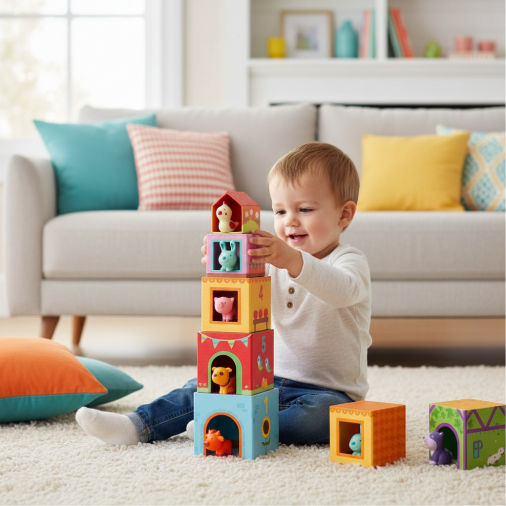 Topanifarm – veža z kociek so zvieratkami od značky Djeco je hravá manipulačná hračka, ktorá deťom ponúka viacero spôsobov hry v jednom. Deti môžu stavať farebné kocky na seba, vytvoriť vysokú vežu alebo ich použiť samostatne pri hre so zvieratkami a farmárskymi motívmi. Každá kocka je zdobená veselými ilustráciami zvieratiek z farmy a má inú veľkosť, čo deti prirodzene vedie k triedeniu, porovnávaniu a správnemu usporiadaniu. Hra je ideálna pre rozvoj jemnej motoriky, koordinácie a logického myslenia už od útleho veku.Čo Topanifarm rozvíja- jemnú motoriku a koordináciu ruka–oko, logické myslenie a porovnávanie veľkostí, zmysel pre rovnováhu, poznávanie zvieratiek a farieb, kreativitu a fantáziu. Prečo si vybrať Topanifarm od Djeco- viacero herných možností v jednej hračke, pevné kartónové kocky vhodné pre malé ruky, krásne ilustrácie so zvieratkami z farmy, ideálne ako prvá stohovacia hračka, vhodné pre deti od cca 12 mesiacov