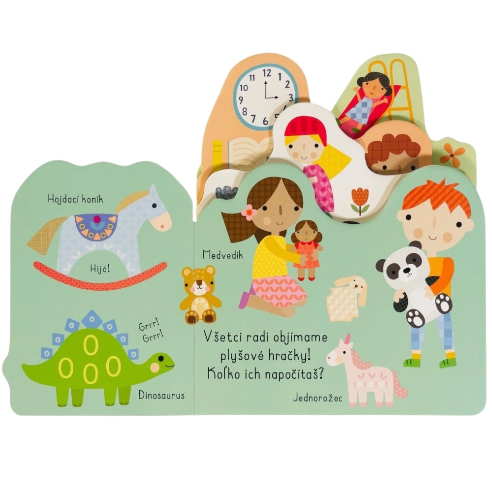 Tvarované leporelo - HračkyHračky pre malé zvedavé detiTvarované leporelo – Hračky je veselé a hravé leporelo s rôzne tvarovanými stránkami, ktoré zoznámi malé deti s hračkami, hraním a aktivitami každodenného života. Každá stránka je navrhnutá tak, aby zaujala detské prstíky a podnietila ich zvedavosť – čo sa skrýva na ďalšej stránke? Milé ilustrácie dopĺňajú jednoduché popisy hračiek a aktivít a obsahujú otázky, ktoré povzbudzujú rozhovory medzi rodičmi a deťmi o hrách, kamarátstve či dňoch v škôlke. Leporelo rozvíja slovnú zásobu, fantáziu a podporuje spoločné čítanie, pričom každé listovanie je pre deti zmyslovým zážitkom.