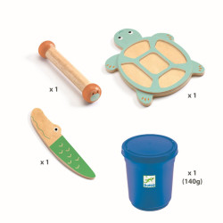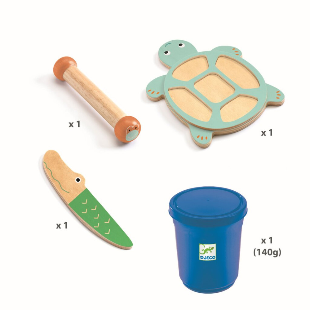 Tvorenie s plastelínou Korytnačka je opakovane použiteľná kreatívna sada značky Djeco pre deti od 18 mesiacov. Dieťa najprv plastelínu rozvaľká bezpečným dreveným valčekom, aby vznikla rovnomerná „placka“, potom ju nakrája tupým dreveným nožíkom v tvare krokodíla a jednotlivé plátky vkladá do výrezov na drevenej korytnačke. Výsledok je rýchly, prehľadný a deti ho zvládnu aj bez dlhého vysvetľovania.Najväčšia výhoda je, že aktivitu možno robiť znova a znova – plastelínu z formy jednoducho vyberiete a dieťa môže skúšať ďalší pokus. Pri hre si prirodzene precvičuje jemnú motoriku, koordináciu oko–ruka a silu prstov. Pomáha aj obrázkový návod, ktorý vedie dieťa krok za krokom.Rýchly prehľad odporúčaný vek: 18m+ čo dieťa robí: vaľká, krája a vkladá plastelínu do formy hlavný motív: drevená korytnačka (forma na zdobenie) pomôcky: drevený valček so silnými koncami, drevený „krokodíl“ nožík opakované hranie: plastelína sa vyberie a tvorí sa znova rozmery balenia: cca 23 × 10 × 7 cm rozvíja: jemnú motoriku, koordináciu oko–ruka, trpezlivosť, vnímanie tvarovPrečo si to deti zamilujú bezpečné drevené náradie prispôsobené malým rukám aktivita je krátka, jasná a ľahko sa opakuje dieťa sa cíti samostatné vďaka obrázkovému návoduObsah balenia 1× drevená korytnačka (forma na zdobenie) 1× drevený valček so silnými koncami 1× drevený nožík v tvare krokodíla plastelína obrázkový návod Technické parametre značka: Djeco model: DJ09032 vek: 18m+ typ aktivity: vaľkanie, krájanie a vkladanie plastelíny