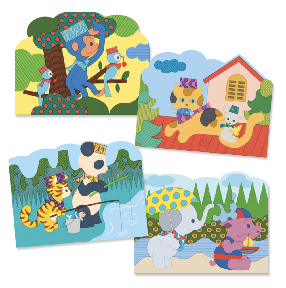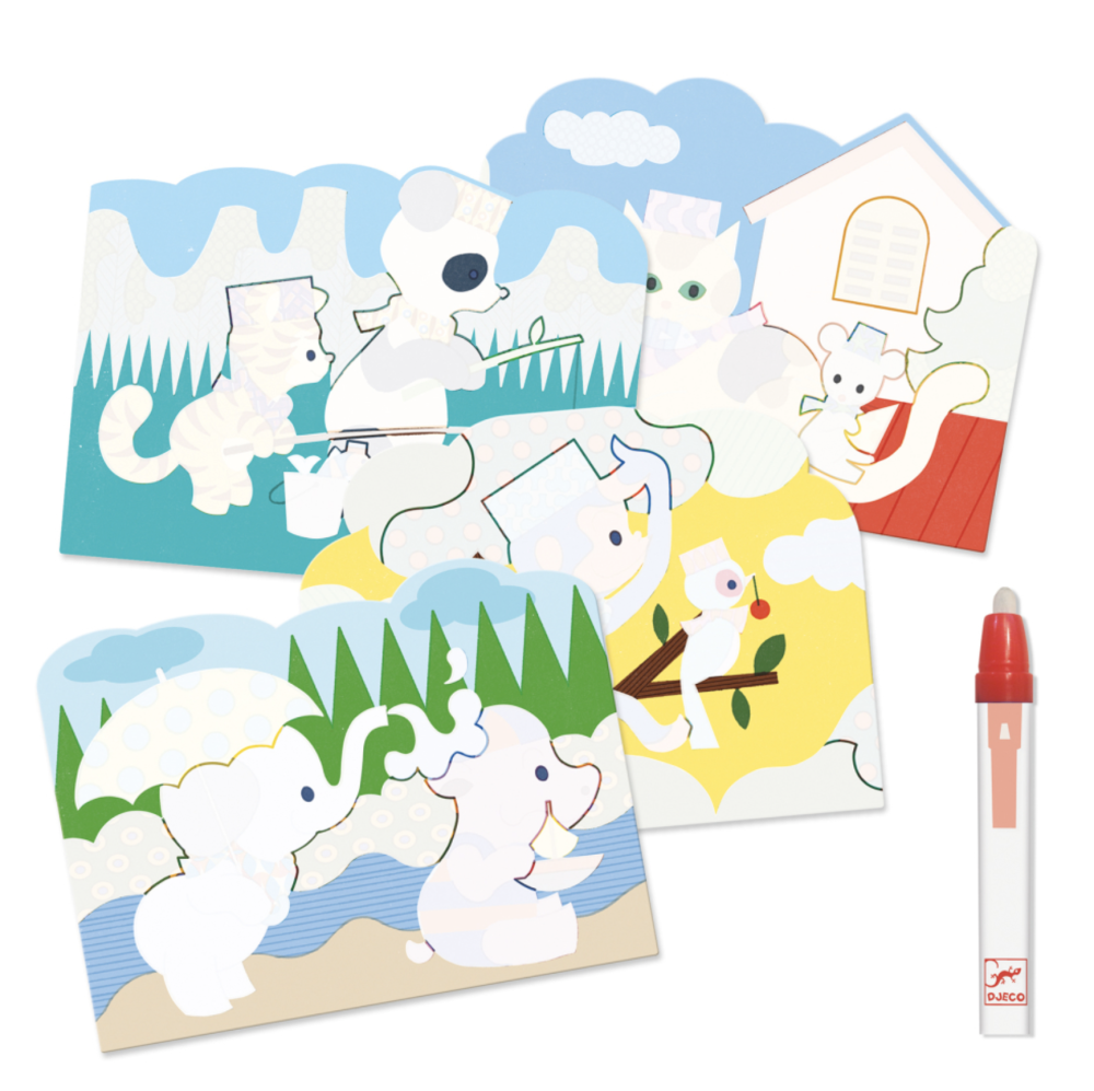 Vonku je dobre, vonku s kamarátmi ešte lepšie! Opakovane použiteľná malá kreatívna sada 4 obrázkov na magické vyfarbovanie vodou je ideálna na vzbudenie záujmu batoliat o maľovanie a na rozvoj jemnej motoriky. Atraktívne ilustrované obrázky z ohybného plastu majú špeciálne biele plôšky. Po pretretí plôšok vodou sa ukážu farebné ilustrácie pod nimi. Po uschnutí opäť zbelejú a magické objavovanie so štetcom v ruke môže začať odznova. Štetec má široký a pevný filcový hrot a nádržku na vodu. Balené v praktickej priehľadnej fóliovej obálke.