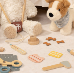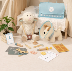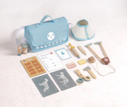Drevená veterinárna súprava pre deti Tooky Toy v textilnej taške umožňuje deťom hrať sa na veterinára všade naokolo! Vďaka bohatému drevenému vybaveniu, ako je fonendoskop, teplomer, rôzne lieky, injekcie, röntgen a ďalšie, sa budú cítiť ako skutoční profesionáli. Po úspešnom zákroku si zasa všetko veterinárne vybavenie uložia do látkovej tašky na rameno. Súprava je skvelá vďaka svojej skladnosti a menšej veľkosti! Vďaka tomu si celú veterinárnu súpravu pre deti môžete ľahko vziať so sebou na cesty.