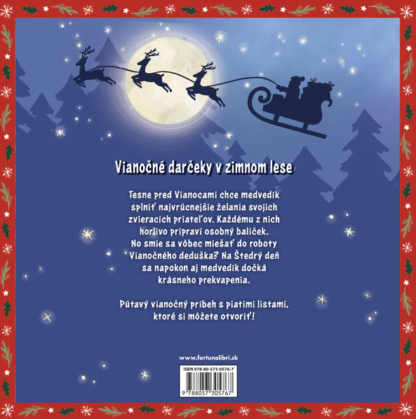 Tesne pred Vianocami chce medvedík splniť najvrúcnejšie želania svojich zvieracích priateľov. Každému z nich horlivo pripraví osobný balíček. No smie sa vôbec miešať do roboty Vianočného deduška? Na Štedrý deň sa napokon aj medvedík dočká krásneho prekvapenia.Pútavý vianočný príbeh s piatimi listami, ktoré si môžete otvoriť!Ideálne čítanie na predvianočné večery pre deti.