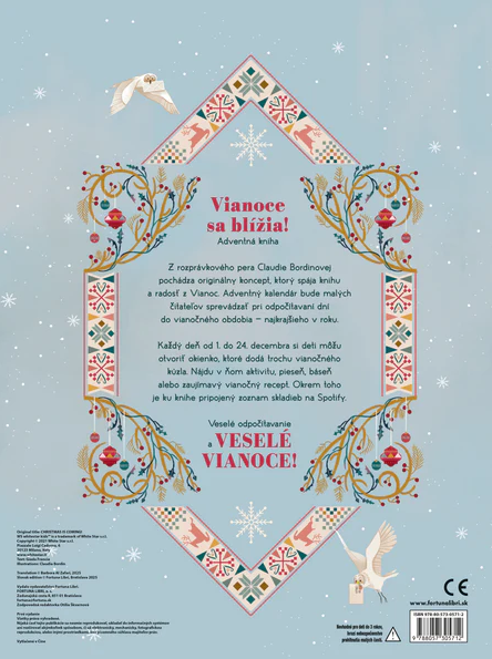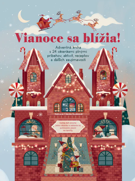 Vianoce sa blížiaVianoce sa blížia – jedinečná adventná kniha pre deti plná aktivít, básničiek, piesní a vianočných receptov.Adventná kniha Z rozprávkového pera Claudie Bordinovej pochádza originálny koncept, ktorý spája knihu a radosť z Vianoc. Adventný kalendár bude malých čitateľov sprevádzať pri odpočítavaní dní do vianočného obdobia – najkrajšieho v roku. Každý deň od 1. do 24. decembra si deti môžu otvoriť okienko, ktoré dodá trochu vianočného kúzla. Dokonalá sviatočná tradícia pre celú rodinu.Nájdu v ňom aktivitu, pieseň, báseň alebo zaujímavý vianočný recept. Okrem toho je ku knihe pripojený zoznam skladieb na Spotify. Veselé odpočítavanie a VESELÉ VIANOCE!.