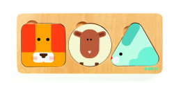 Vkladacie puzzle Zvieratá Drevené 3-vrstvové mini puzzle pozostáva z vkladacej podložky a 9 dielikov Dieliky v tvare štvorca, kruhu a trojuholníka sa vyznačujú geometrickou kresbou znázorňujúcou zvieratko. Výhoda takéhoto stvárnenia spočíva v tom, že je zábavné hádať, aké zvieratká sú na dielikoch znázornené.Zároveň sa tak vizuálne prepája matematika s prírodou Úlohou dieťaťa je vkladať do dosky jednotlivé dieliky, logicky ich vrstviť podľa tvaru a veľkosti. Hračka patrí do produktovej série Basic, ktorá je určená pre prvé vzdelávacie úlohy. Vyznačuje sa minimalistickým dizajnom a jemnými farbami v kombinácii s prírodnou farbou dreva. Podporuje spoznávanie tvarov, farieb, utváranie matematických predstáv, rozvoj jemnej motoriky a logického myslenia.Odporúčaný vek: 12m+