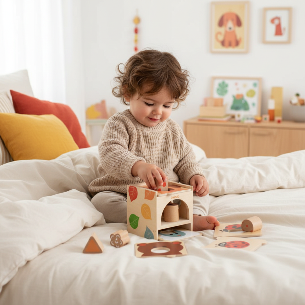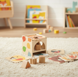 Originálny triediaci drevený box pre deti od 18 mesiacov vyrobený z FSC® dreva. Rodič vyberie dosku zvieratka s geometrickým otvorom (štvroec, kruh, polkruh, trojuholník alebo hviezdička) a zasunie ho navrh krabičky. Dieťa sa potom hrá vkladaním toho správneho z 5 tvarov pasujúceho do otvoru.Z certifikovaného dreva pre bezpečnú hru Výhody:• spodok krabičky je vystlaný plsťou pre menší hluk pri páde kusov• spodok krabičky je naklonený, takže kúsky sa dajú ľahko znova vytiahnuť• všetko sa zmestí do krabičky• umožňuje vášmu dieťaťu sústrediť sa na 1 tvar naraz• drevo s ekologickým certifikátom FSC®Obsah:• 1 box/krabička, 5 dosiek s otvormi a 5 drevených dielikov