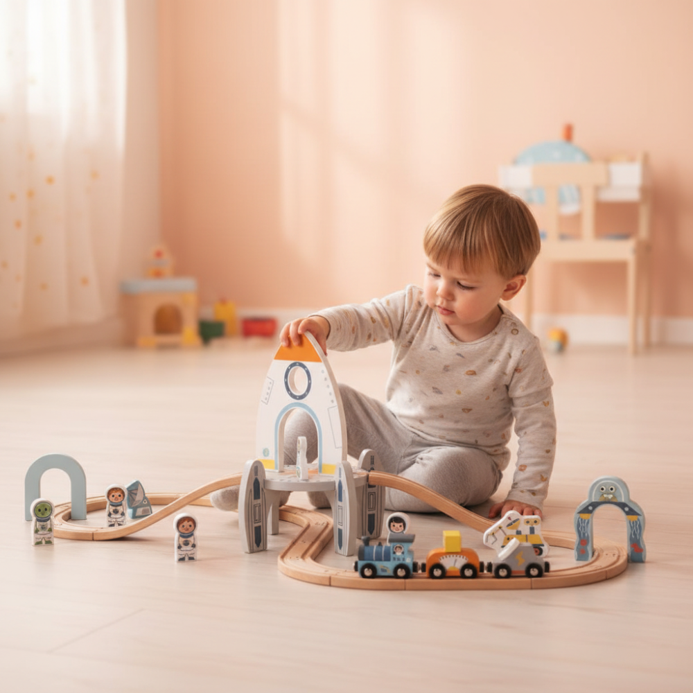 Súprava obsahuje vlak, ktorý prechádza vesmírom, drevené figúrky astronautov, ale aj iné drevené figúrky, ako je mimozemšťan alebo ufo. V strede vláčikovej dráhy sa nachádza veľká vesmírna raketa.
