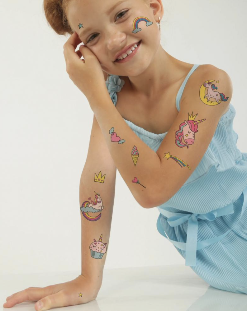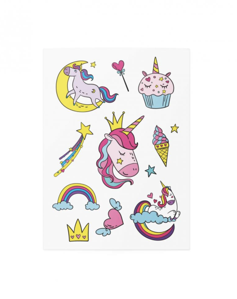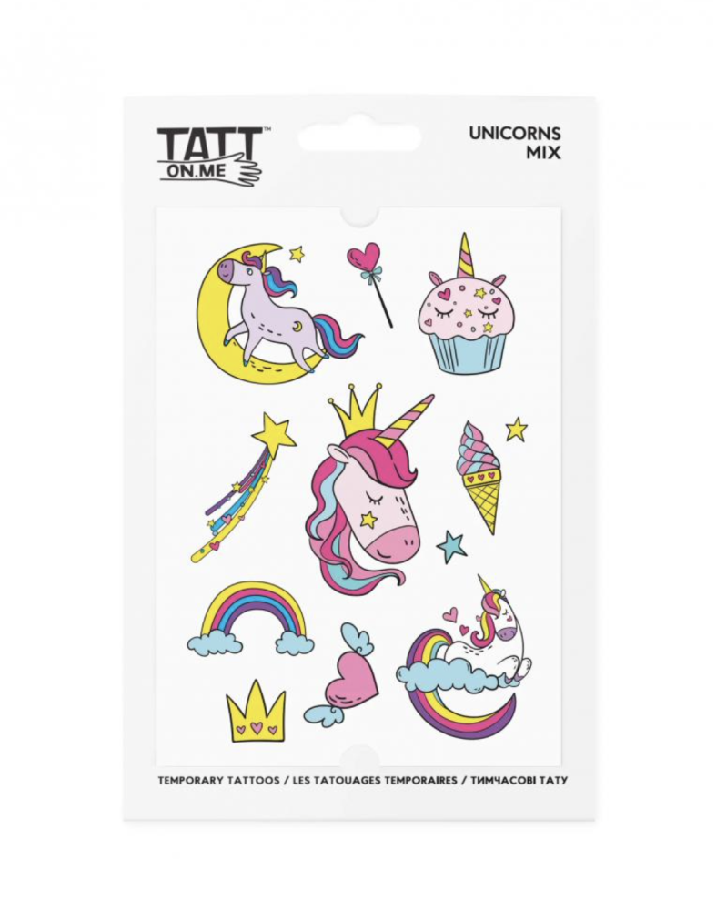 Čo potrebujú malé princezné, aby vládli svojmu kráľovstvu? Zmrzlina, muffiny, magické jednorožce, dúha. Náš mix dočasných tetovaní Jednorožce má všetko.