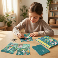 Vyškrabovacie obrázky Jazero s dúhovým leskom sú tvorivá sada, v ktorej deti postupne odhaľujú skryté ilustrácie vyškrabovaním povrchovej vrstvy.Kartičky majú špeciálne dúhové, metalicky lesklé efekty, vďaka ktorým hotové obrázky žiaria a menia sa podľa svetla.Dieťa pracuje s obojstranným dreveným perom a podľa ilustrovaného návodu vyškrabuje pripravené línie a ornamenty.Krok za krokom sa objavujú detaily „jazerného sveta“ – voda, rastliny aj drobné prekvapenia ukryté v ilustrácii.Rýchly prehľad odporúčaný vek: 7 – 12 rokov rozvíja: jemnú motoriku, presnosť, sústredenie, trpezlivosť, cit pre detail v balení: 4 vyškrabávacie kartičky 15 × 20 cm, drevené pero, farebný návod. Prečo si ich deti zamilujú magický efekt – dúhové odlesky sa ukazujú pri každom ťahu tiché tvorenie „bez neporiadku“ – bez farieb a bez lepidla jasný postup podľa návodu, no stále priestor na vlastné vzory 4 hotové obrázky – skvelý pocit z dokončeného dielaAko to funguje Vyber si kartičku a polož ju na rovný, pevný povrch. Pomocou pera jemne vyškrabuj línie a plochy podľa farebného návodu. Striedaj tenké a širšie ťahy – vytvoríš textúry, vzory a lesklé detaily. Hotový obrázok jemne očisti od prachu z vyškrabovania.Obsah balenia 4× vyškrabávacia kartička (15 × 20 cm) s dúhovými odleskami 1× obojstranné drevené pero 1× farebný návod krok za krokom. Technické parametre materiál: kartón/papier, drevo počet obrázkov: 4 rozmer kartičiek: 15 × 20 cm rozmery balenia: cca 22 × 23 cm