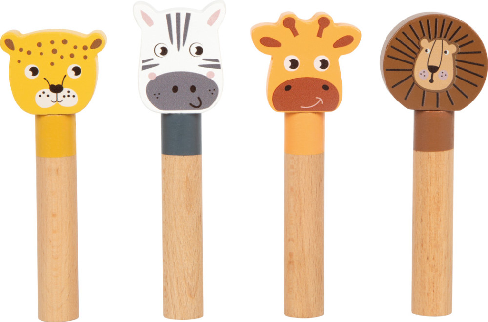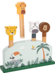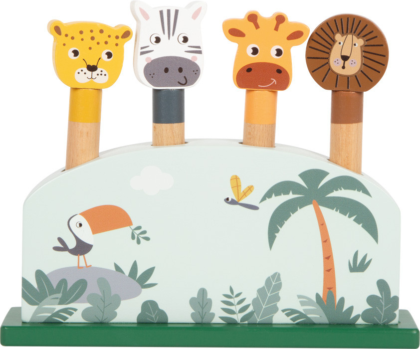 Štyri veselé zvieratká – žirafa, lev, zebra a leopard – čakajú, až ich deti zatlačia a pozorujú, ako s úsmevom vystrelia do vzduchu. Každé zvieratko sa vkladá do svojho otvoru a pomocou pružinového mechanizmu vyskočí – prekvapivý efekt, ktorý rozvíja reakcie, koordináciu očí a rúk aj jemnú motoriku.