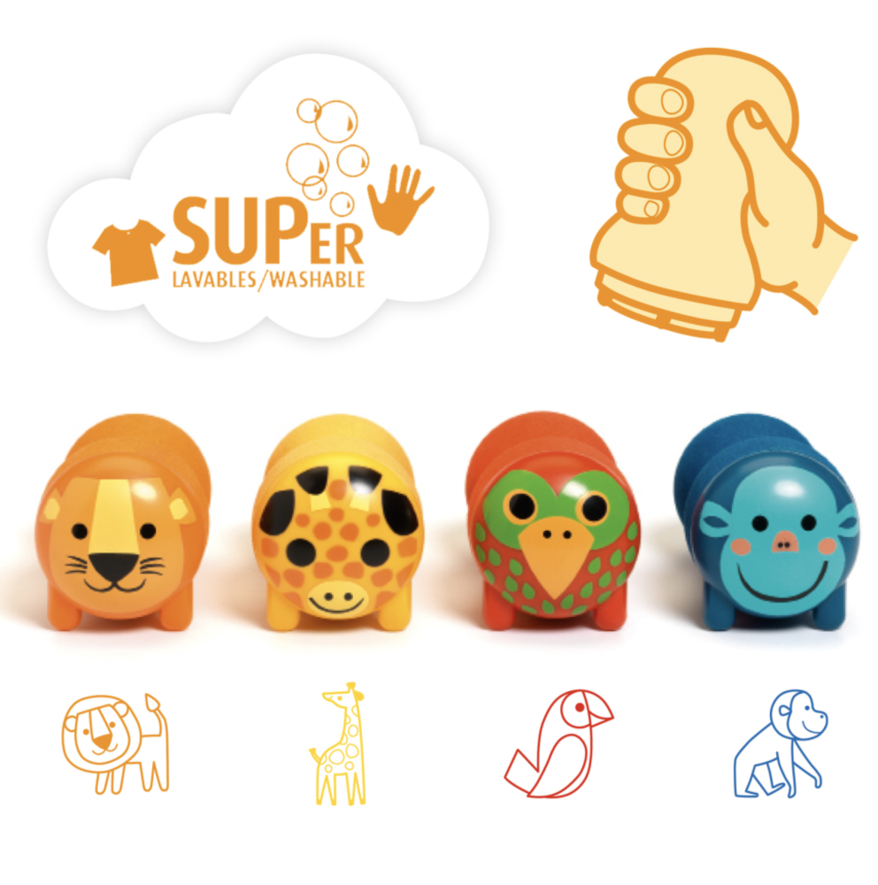 Sada 4 ergonomických pečiatok pre drobcov s motívmi zvieratiek zo savany. Každé zvieratko má svoju farbu: lev je oranžový, žirafa žltá, papagáj červený, opica modrá.