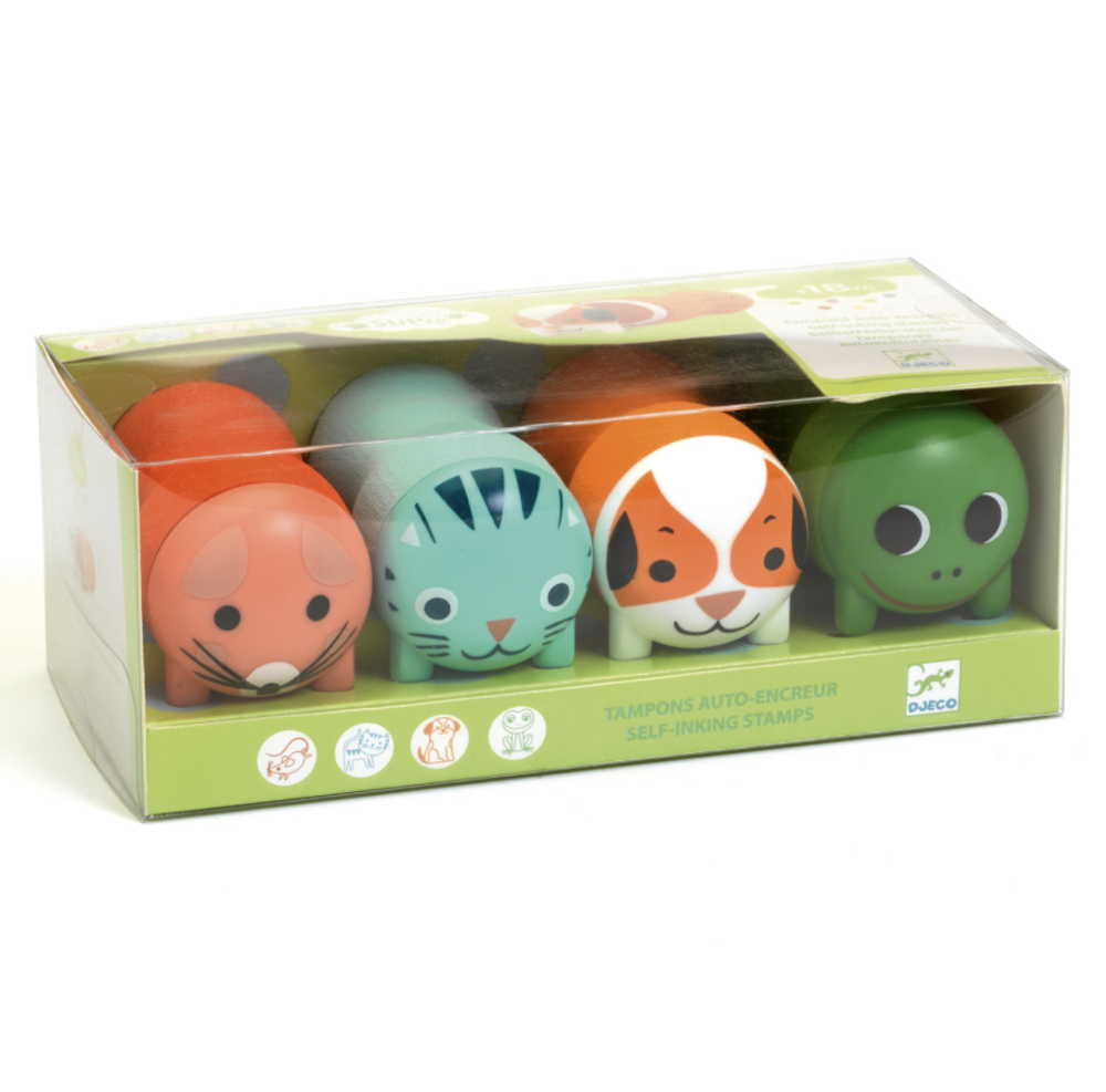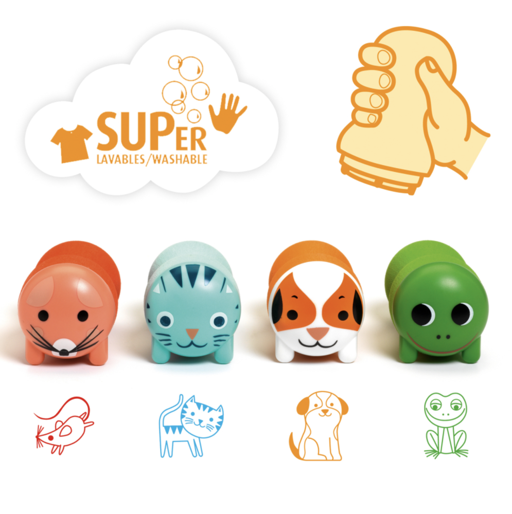 Sada 4 ergonomických pečiatok pre drobcov s motívmi zvieratiek zo záhradky. Každé zvieratko má svoju farbu: myš je červená, mačka modrá, pes oranžový a žabka zelená.